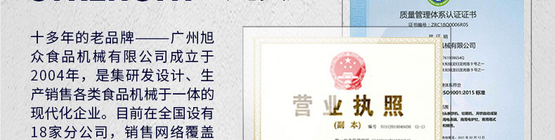 廣州旭眾食品機(jī)械有限公司是一家集科研開發(fā),生產(chǎn)設(shè)計,營銷服務(wù)為一體的現(xiàn)代化生產(chǎn)企業(yè)?,F(xiàn)代化生產(chǎn)車間,精湛制造技術(shù),所產(chǎn)機(jī)械歷經(jīng)市場重重考驗,不斷贏得海內(nèi)外客戶的贊譽(yù)。