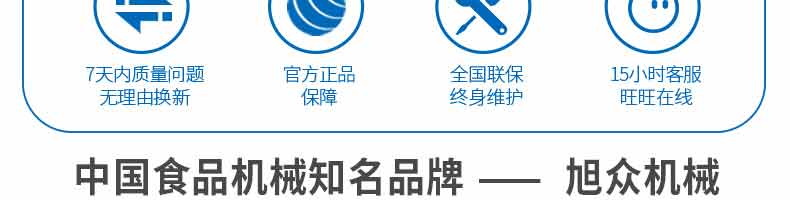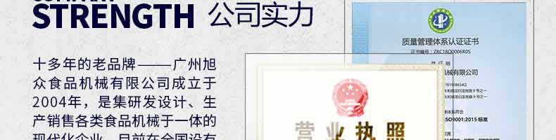 廣州旭眾食品機(jī)械有限公司是一家集科研開發(fā),生產(chǎn)設(shè)計(jì),營銷服務(wù)為一體的現(xiàn)代化生產(chǎn)企業(yè)?,F(xiàn)代化生產(chǎn)車間,精湛制造技術(shù),所產(chǎn)機(jī)械歷經(jīng)市場(chǎng)重重考驗(yàn),不斷贏得海內(nèi)外客戶的贊譽(yù)。