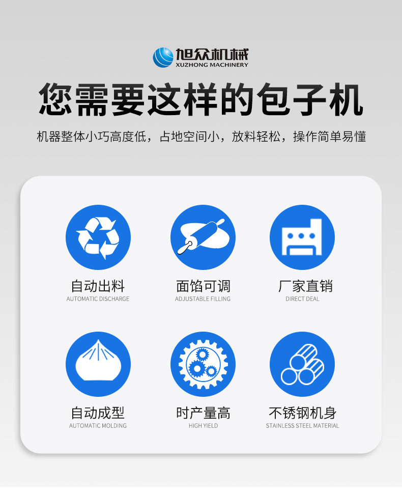 作者:旭眾機(jī)械發(fā)布時間:2021-04-26 17:44查看數(shù):您當(dāng)前的位置:首頁>>產(chǎn)品展示>>面制品加工系列>>包子機(jī)系列