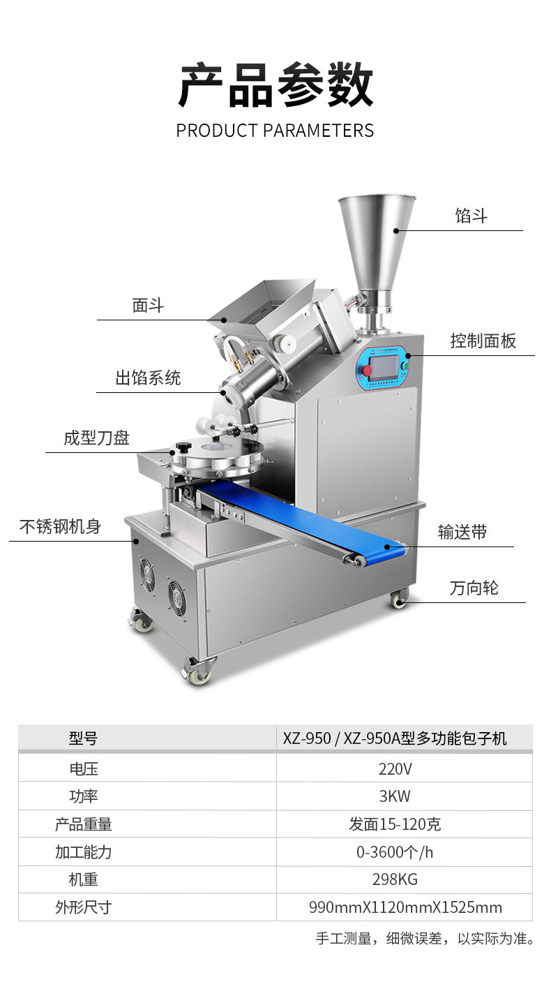 名稱XZ-950型多功能包子機(jī) 電源220V 功率3KW 產(chǎn)量0-3600個/h 尺寸990mmxl120mmx1525mm 重量298KG 規(guī)格發(fā)面15-120克 其他
