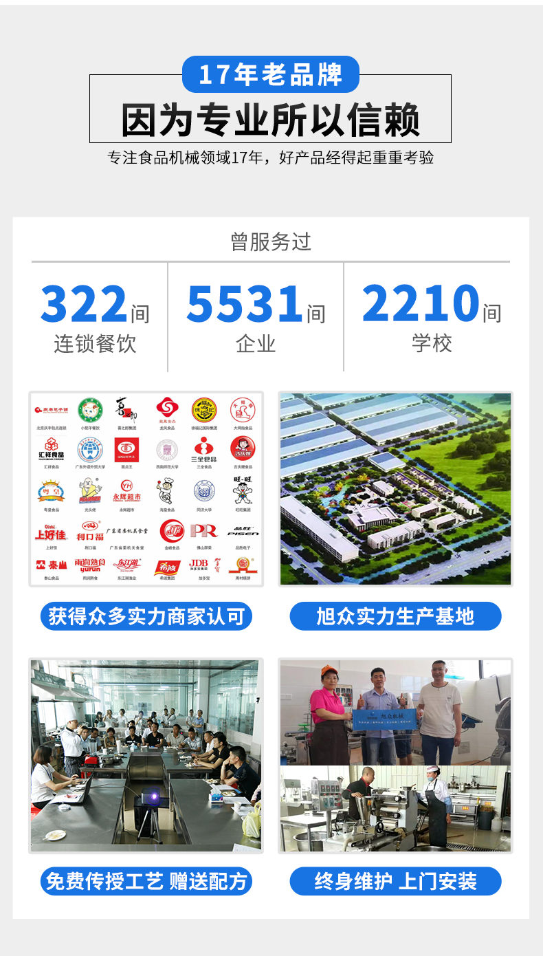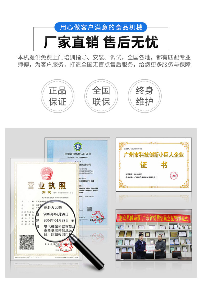 廣州旭眾食品機(jī)械有限公司是一家集科研開發(fā),生產(chǎn)設(shè)計,營銷服務(wù)為一體的現(xiàn)代化生產(chǎn)企業(yè)?,F(xiàn)代化生產(chǎn)車間,精湛制造技術(shù),所產(chǎn)機(jī)械歷經(jīng)市場重重考驗,不斷贏得海內(nèi)外客戶的贊譽(yù)。