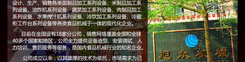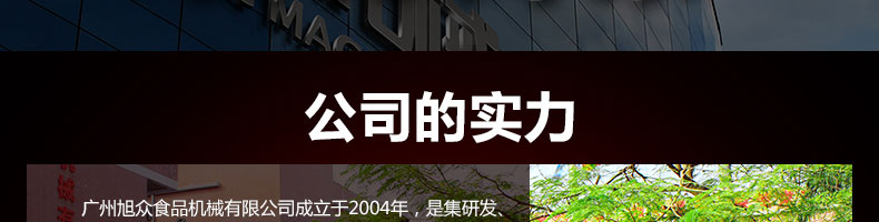 廣州旭眾食品機(jī)械有限公司是一家集科研開(kāi)發(fā),生產(chǎn)設(shè)計(jì),營(yíng)銷(xiāo)服務(wù)為一體的現(xiàn)代化生產(chǎn)企業(yè)?,F(xiàn)代化生產(chǎn)車(chē)間,精湛制造技術(shù),所產(chǎn)機(jī)械歷經(jīng)市場(chǎng)重重考驗(yàn),不斷贏得海內(nèi)外客戶(hù)的贊譽(yù)。
