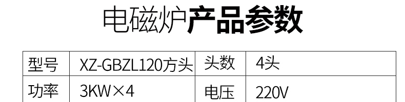 名稱XZ-TBZL120方頭臺式電磁爐 電源220V 功率3KW×4 產(chǎn)量聯(lián)系銷售員 尺寸760×830×230MM 重量聯(lián)系銷售員 規(guī)格頭數(shù):4頭 其他