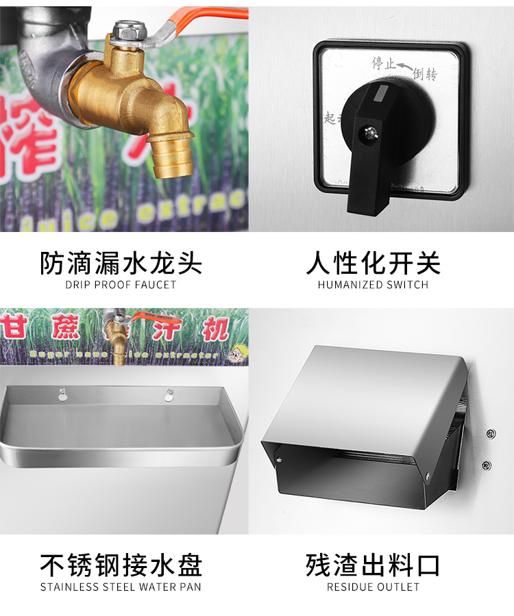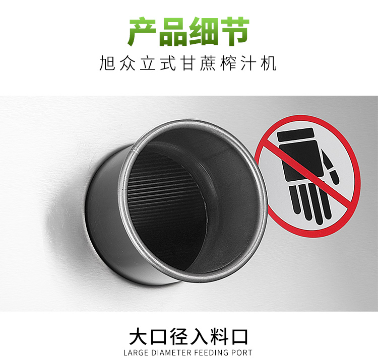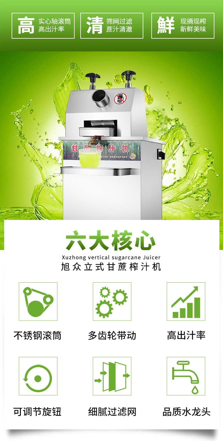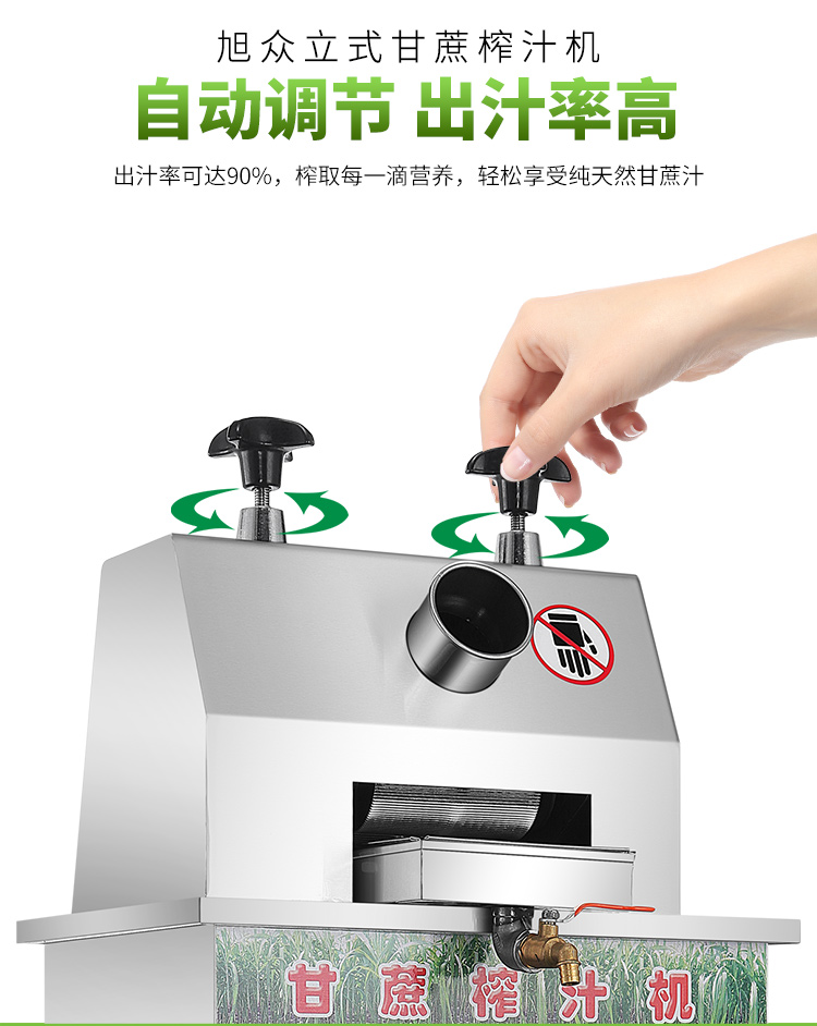 立式甘蔗機,該機采用不銹鋼材質(zhì)加工,機頭部件都經(jīng)過嚴格的防銹仿腐蝕處理,整機采用全封閉結(jié)構(gòu),可內(nèi)置蔗渣桶,保證渣汁不外泄,安全、干凈、衛(wèi)生。 適合賓館、卡拉OK廳、水果店、冷飲店、涼茶店、車站、超市等服務(wù)行業(yè)壓榨各種甘蔗之用。