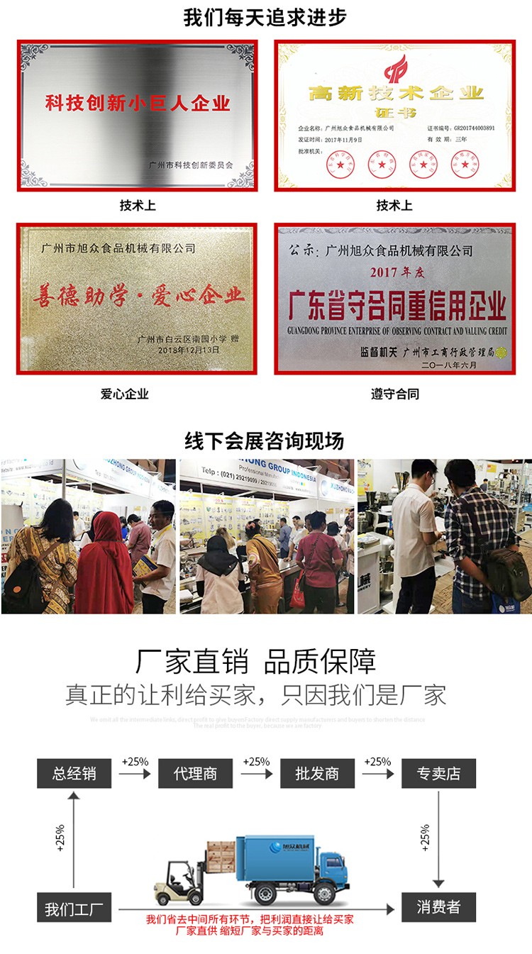 廣州旭眾食品機械有限公司是一家集科研開發(fā),生產(chǎn)設(shè)計,營銷服務(wù)為一體的現(xiàn)代化生產(chǎn)企業(yè)?,F(xiàn)代化生產(chǎn)車間,精湛制造技術(shù),所產(chǎn)機械歷經(jīng)市場重重考驗,不斷贏得海內(nèi)外客戶的贊譽。