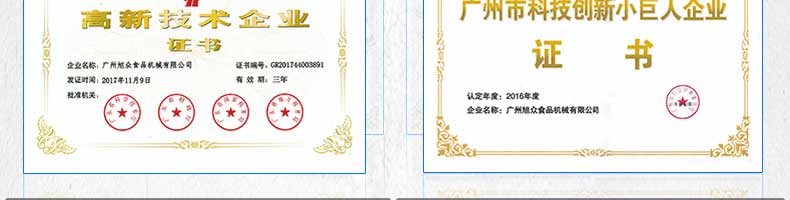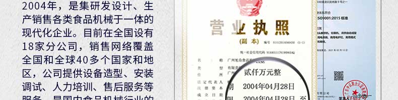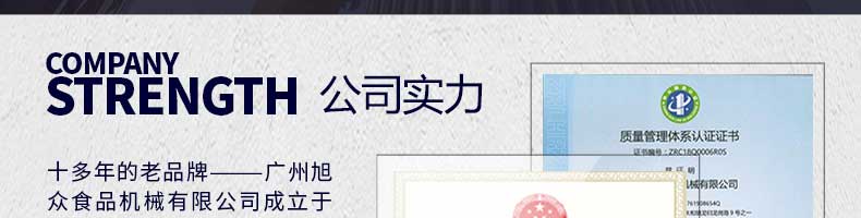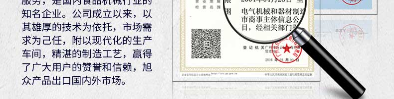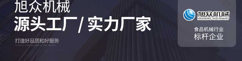 廣州旭眾食品機械有限公司是一家集科研開發(fā),生產設計,營銷服務為一體的現代化生產企業(yè)。現代化生產車間,精湛制造技術,所產機械歷經市場重重考驗,不斷贏得海內外客戶的贊譽。