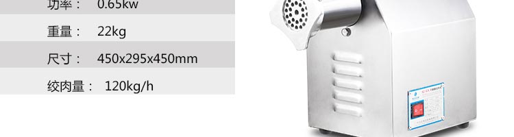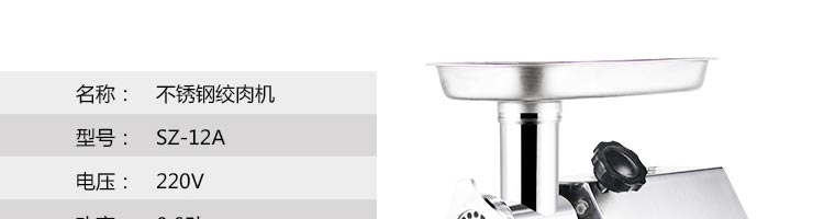 名稱(chēng)SZ-12A 絞肉機(jī) 電源220v 功率0.65kw 產(chǎn)量120kg 尺寸450*295*450mm 重量22kg 規(guī)格 其他