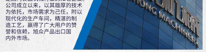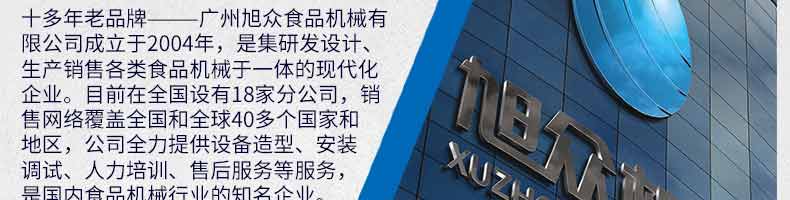 廣州旭眾食品機(jī)械有限公司是一家集科研開(kāi)發(fā),生產(chǎn)設(shè)計(jì),營(yíng)銷(xiāo)服務(wù)為一體的現(xiàn)代化生產(chǎn)企業(yè)。現(xiàn)代化生產(chǎn)車(chē)間,精湛制造技術(shù),所產(chǎn)機(jī)械歷經(jīng)市場(chǎng)重重考驗(yàn),不斷贏得海內(nèi)外客戶(hù)的贊譽(yù)。