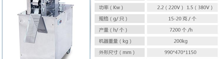 名稱JGB-120-5B型餃子機(jī) 電源220/380V(見(jiàn)機(jī)器名牌) 功率2.2kw(220V)1.5KW(380V) 產(chǎn)量7200個(gè)/小時(shí) 尺寸外形尺寸770*460*1190mm 重量200kg 規(guī)格15-20克/個(gè) 其他