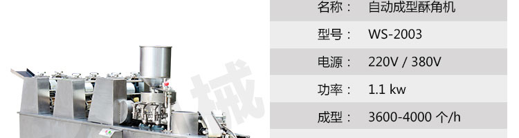 名稱WS-2003 型自動成型酥角機(油餃機) 電源220/380V 功率1.1kw 產量3600-4000個/小時 尺寸外形尺寸3150*500*1300mm 重量450kg 規(guī)格 其他
