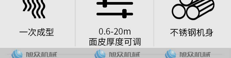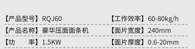 名稱RQJ60豪華型壓面面條機 電源咨詢銷售員 功率15KW 產(chǎn)量60-80kg/h 尺寸1000510X1180mm 重量11lkg 規(guī)格【機面片寬度】240mm 【面片厚度】0.6-20mm 其他