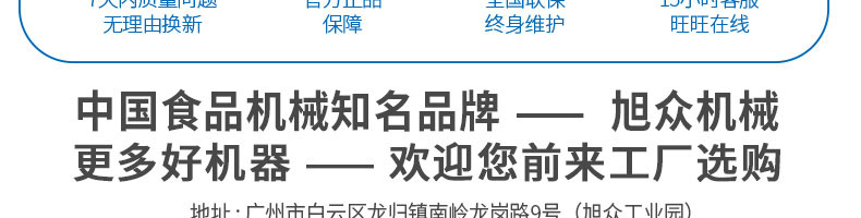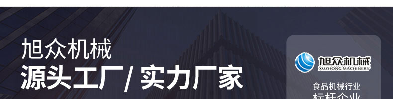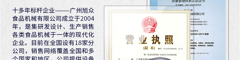 廣州旭眾食品機(jī)械有限公司是一家集科研開發(fā),生產(chǎn)設(shè)計(jì),營銷服務(wù)為一體的現(xiàn)代化生產(chǎn)企業(yè)?,F(xiàn)代化生產(chǎn)車間,精湛制造技術(shù),所產(chǎn)機(jī)械歷經(jīng)市場(chǎng)重重考驗(yàn),不斷贏得海內(nèi)外客戶的贊譽(yù)。