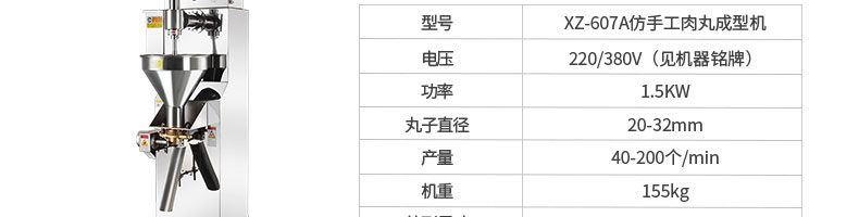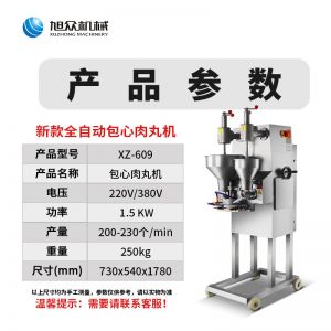 名稱XZ-609包餡肉丸機(jī) 電源220/380v 功率1.5kw 產(chǎn)量200-300個(gè)/min 尺寸730*540*1780mm 重量250kg 規(guī)格丸子直徑:28-36mm 其他