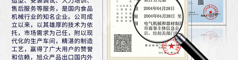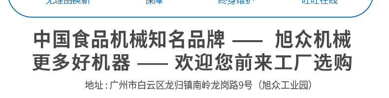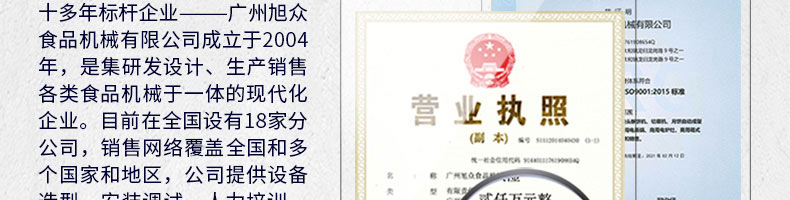 廣州旭眾食品機(jī)械有限公司是一家集科研開發(fā),生產(chǎn)設(shè)計(jì),營銷服務(wù)為一體的現(xiàn)代化生產(chǎn)企業(yè)?,F(xiàn)代化生產(chǎn)車間,精湛制造技術(shù),所產(chǎn)機(jī)械歷經(jīng)市場(chǎng)重重考驗(yàn),不斷贏得海內(nèi)外客戶的贊譽(yù)。