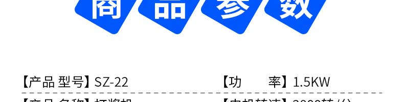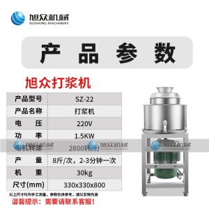 名稱SZ-22快速打漿機(jī) 電源220V 功率1.5KW 產(chǎn)量8斤次,2-3分鐘一次 尺寸330X300X780 重量30kg 規(guī)格聯(lián)系銷(xiāo)售員 其他【電機(jī)轉(zhuǎn)速】2800轉(zhuǎn)/分