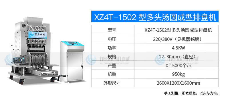 名稱XZ4T -1502多頭湯圓成型排盤機 電源220/380V(見機器銘牌) 功率4.5KW 產(chǎn)量0-15000個/h 尺寸2600x1200x1600mm 重量950kg 規(guī)格22-30mm(直徑) 其他