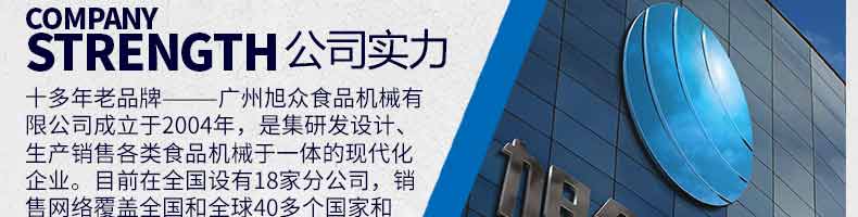 廣州旭眾食品機(jī)械有限公司是一家集科研開發(fā),生產(chǎn)設(shè)計(jì),營銷服務(wù)為一體的現(xiàn)代化生產(chǎn)企業(yè)?,F(xiàn)代化生產(chǎn)車間,精湛制造技術(shù),所產(chǎn)機(jī)械歷經(jīng)市場(chǎng)重重考驗(yàn),不斷贏得海內(nèi)外客戶的贊譽(yù)。