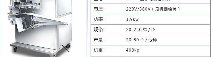 名稱SZ-65型多功能自動(dòng)包餡機(jī) 電源220/380V 功率1.9kw 產(chǎn)量20-80個(gè)/分鐘 尺寸1130*920*1650mm 重量400kg 規(guī)格20-250克/個(gè) 其他皮餡比例2:8 5:5