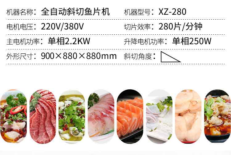 名稱XZ-280斜切魚片機 電源220/380V 功率單相2.2kw 產量 尺寸900×880×880mm 重量 規(guī)格 其他