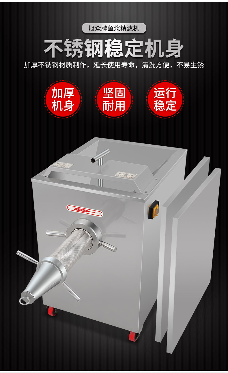 SZJ-300魚漿精濾機,商用創(chuàng)業(yè)魚漿精濾機,用于配套魚肉采肉機進行魚肉過濾雜質(zhì)。節(jié)省人工開支,人工加工魚漿,效率慢剔除魚細骨,不干凈,有了魚漿精濾機,一人就可以很快制作多種魚漿。