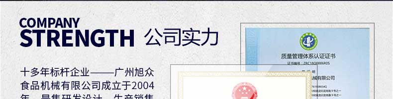 廣州旭眾食品機(jī)械有限公司是一家集科研開發(fā),生產(chǎn)設(shè)計(jì),營銷服務(wù)為一體的現(xiàn)代化生產(chǎn)企業(yè)。現(xiàn)代化生產(chǎn)車間,精湛制造技術(shù),所產(chǎn)機(jī)械歷經(jīng)市場重重考驗(yàn),不斷贏得海內(nèi)外客戶的贊譽(yù)。